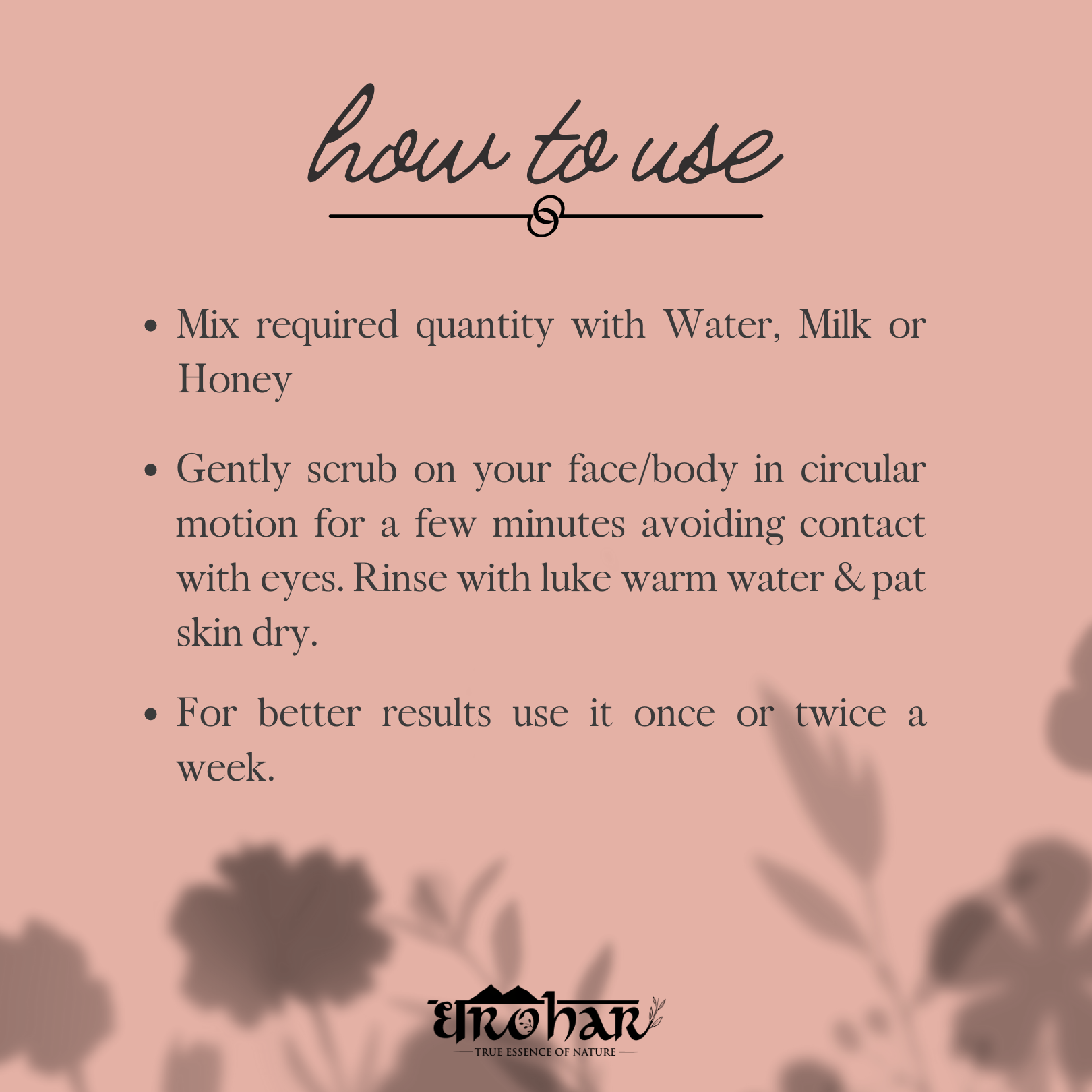 Directions to Use : Mix Dharohar Hibiscus Face and Body Scrub required quantity with(Water, Milk, Honey or Rose Water) and gently scrub on your body in circular motion for a few minutes avoiding contact with eyes. Rinse with lukewarm water & pat skin dry. Use twice a week for best results.